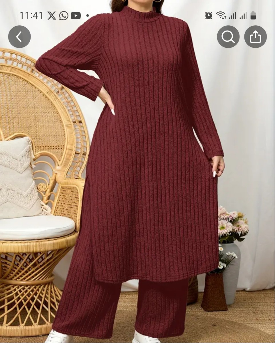 Fig.C - Conjunto de túnica de gola alta com calças largas para Inverno bordeaux plus-size